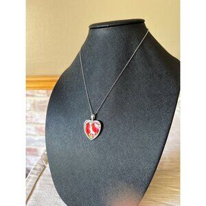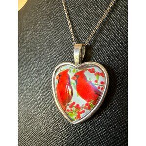 Silver Heart Pendant Necklace Double Design Birds Cardinal Art Adjustable