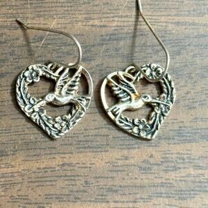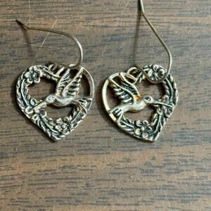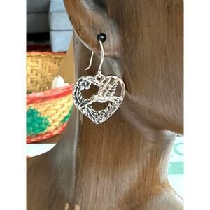 Silver Heart Shaped Humming Bird Pierced Earrings Sterling