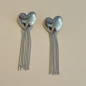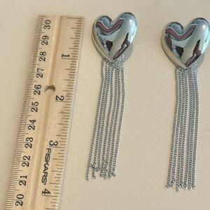 Elegant silver heart earrings with long dangle chains. Perfect for adding a touch of sophistication.
