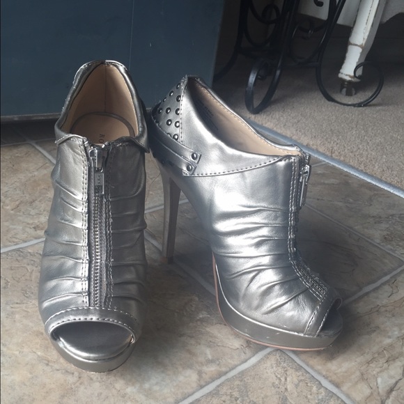 Silver heels from Rock & Republic. There is a zipper on the front. Pretty great condition, just a few scuffs on the heels part but can not be seen. They are edgy and comfortable!