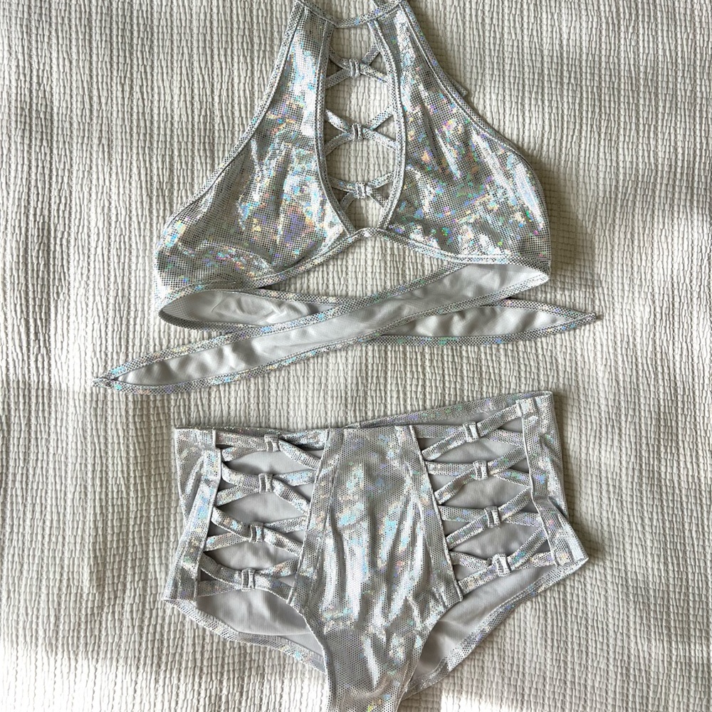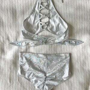 Silver holographic rave set, I think from iHeartRaves but I’m not sure. The top ties at the neck and back and the bottoms have a scrunch butt. Only worn once.