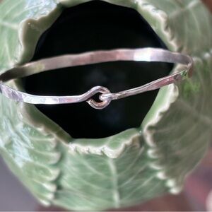 Very delicate hook bracelet. I don’t see any sterling silver markings but it does tarnish. It looks like it has some slight hammering. It definitely looks handmade. See photos for details and measurements.