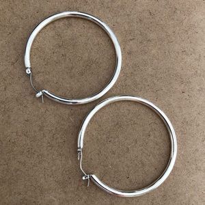 Has some minor discoloration on part of the hoops which is pictured but is barely noticeable when worn. Has a latch back closure. 2 inch hoops. Still fairly light weight when worn. Great to easily coordinate with any outfit.