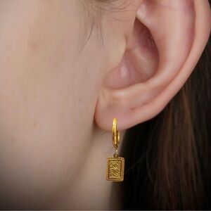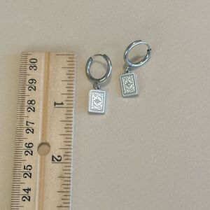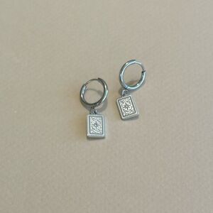 Elegant silver hoop earrings featuring intricate square pendants. Perfect for any occasion.