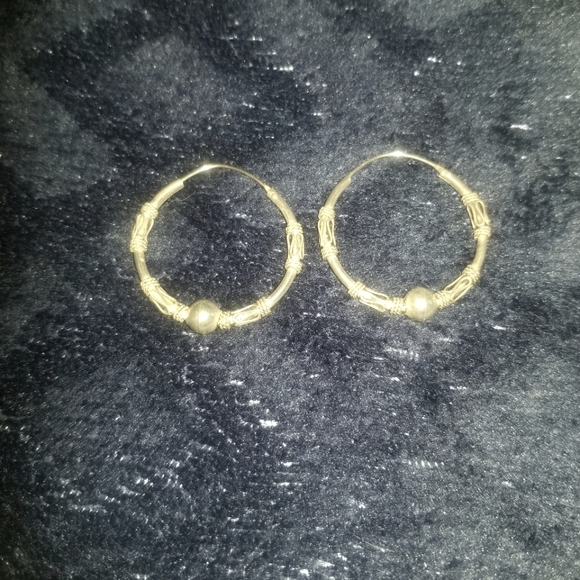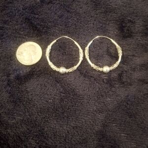 Balu style, sterling silver, hoops. Not stamped but cleans easily with sterling silver polish.