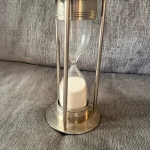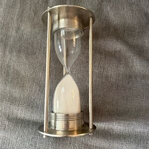 Elegant silver hourglass with clear glass and white sand. Perfect for decor or timing activities.