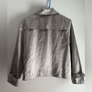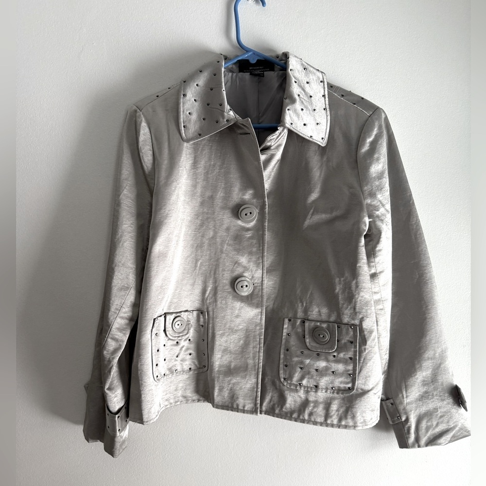Must have silver jacket with cute rhinestones throughout the piece. Very lightweight and material feels really good