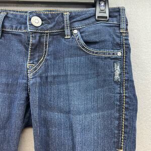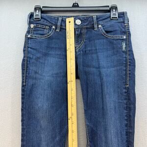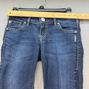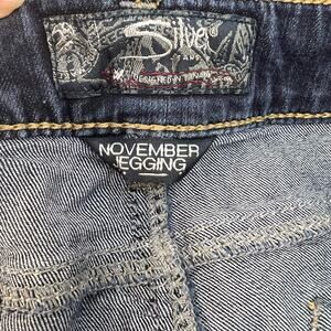 Silver Women's Denim Jeans. Blue in color. Dark denim wash. Tagged size W26 L29. These Silver November jeggings are more lightweight than a traditional Silver jean. They have a five pocket design, a slim profile, embroidered pockets and a low-rise fit. Style number L2196SSR3236. In preowned condition with minimal signs of wear.