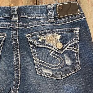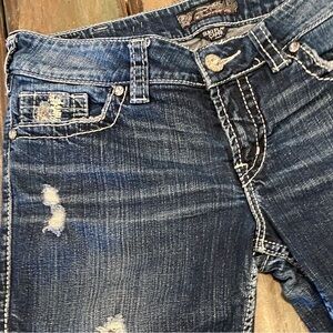 Silver Jeans Size 30 (US 8) Suki Flap Capri Bermuda Denim Jeans Shorts, Mid Rise, Rhinestones, Frayed Cutoff Hems, Embroidered. Preowned. Nice condition. The hems have been cutoff to make these a Bermuda length.