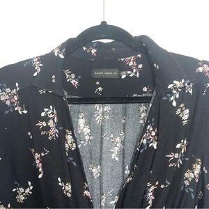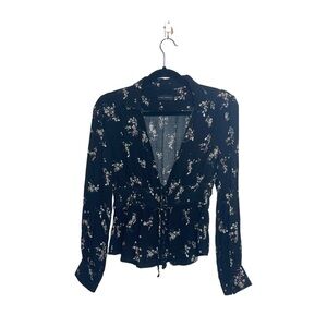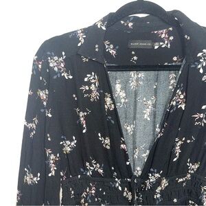 Silver Jeans black floral print peasant blouse. In excellent condition! Collared. Deep V neckline. Long sleeves. Fitted button cuffs. Smocked waistline with tie & button details. True black color with white flowers. Size xsmall.