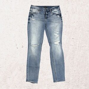 These Silver Jeans feature a relaxed boyfriend fit in a classic blue hue, highlighted by subtle distressed details for a vintage-inspired look. The light to medium wash enhances the casual appeal, making them a versatile choice for everyday wear. Enjoy the perfect blend of comfort and style with these effortlessly chic jeans.
