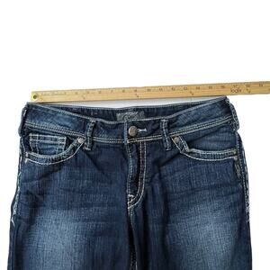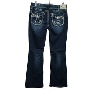 Silver Jeans Co Suki Surplus bootcut jeans in a dark wash with fading and contrast stitching. Embroidered flap back pockets.