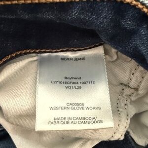Stylish distressed women's jeans in a classic blue color. Perfect for a casual look.