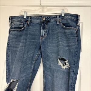 These are in good preowned condition. The knee is very distressed. It does still have the patch behind it though if you choose to sew it back up.