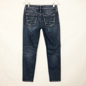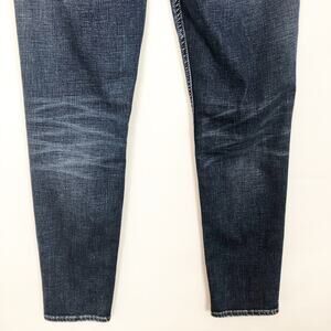 Silver Jeans Boyfriend Fit. Mid-rise. Dark wash. 5-pocket. Whiskering. Distressing at side pockets. Metal button and zipper closure. In good used condition. No stains, tears or holes.