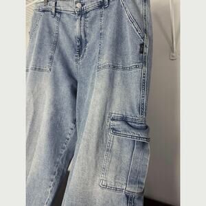 On-trend and versatile, these brand new denim utility cargo jeans are the perfect blend of style and function. Featuring a mid rise, straight leg silhouette, and classic light wash denim, these jeans add a cool utility edge to any casual look. Multiple cargo pockets give them that Y2K-inspired streetwear vibe while still feeling timeless.