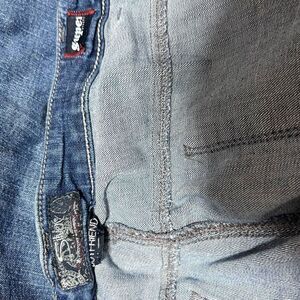 Details: straight leg, high waisted, stretchy, medium wash, factory distressed, embroidered back pockets