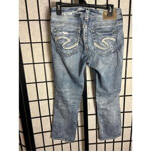Suki Mid Capri Distressed Light Wash Blue Jeans by Silver Jeans Co Front/back pockets