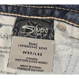 Silver Jeans Co. "Suki" style jeans in a flattering dark wash with signature contrast embroidery on the back pockets. Bootcut silhouette designed to flatter curvier figures with a comfortable mid-rise. Verified Winter color palette