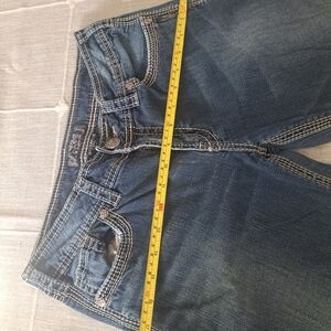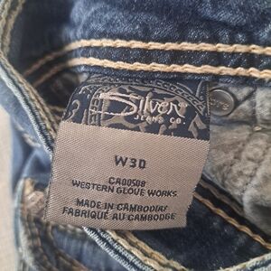 Stylish medium wash denim capris by Silver Jeans Co. Style: Suki Surplus Capri. Features signature Silver stitching, button flap back pockets, and heavy contrast stitching for a classic Y2K look.