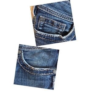 Silver Jeans Co. Suki Surplus back flap pocket stretch denim size 28 x 30. Gently used distressed heavy stitch jeans. 75% cotton, 25% polyester.