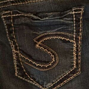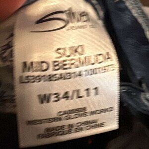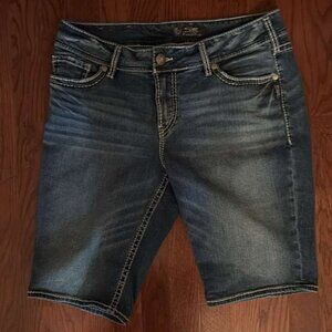Brand: Silver Jeans Co. Style/Fit: Mid-Rise Bermuda Jean Shorts Size: Women's W34 (Waist 34) | Inseam approx. 11 inches Color: Dark Wash Denim with fading/whiskering Condition: Excellent Pre-Owned Condition (EUC) - No visible flaws.