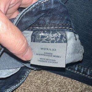 Chic dark blue jeans with a stylish flare. Perfect for casual outings. Shown in last picture paint on the right leg