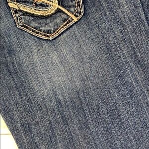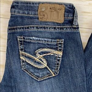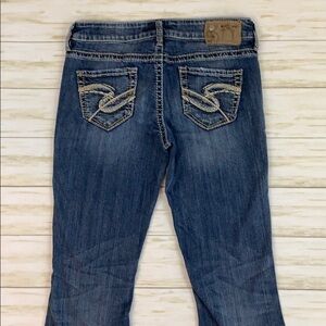 Silver Eden medium wash denim jeans. Intentional fading and fraying at hem and pockets. Women’s size W26/L31. Good used condition.