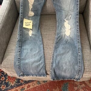 Silver jeans, worn, distressed. 32x33 Frances “18
