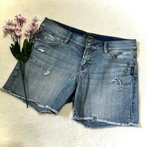 Silver Jeans branded Suki style denim jean shorts in a light wash color, settle distressing, frayed/fringe cut-off hem, higher rise, slightly oversized fit, front and back pockets, zipper and button closure.