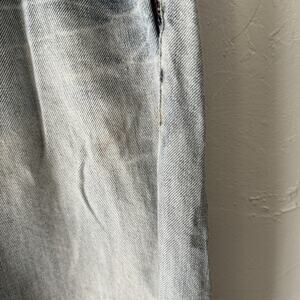 Condition: Fair used condition with visible signs of wear, including distressing on pockets, fraying on the edges, and a faint stain near the right pocket as shown in photos