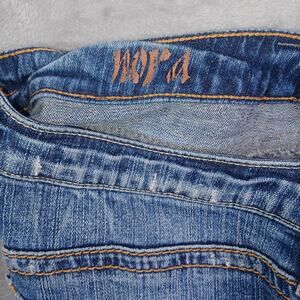 Silver Jeans Nora Flare Jeans Women's Size 28 Blue Low Rise Distressed Y2K 28x35 Stretch Denim Embroidered Pocket Wiskered Y2K 90s Vibes.