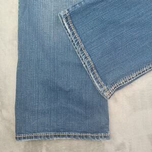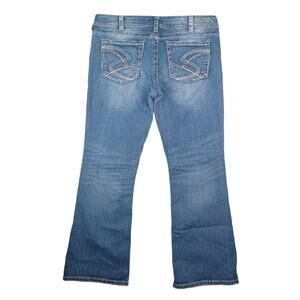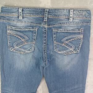 Silver Jeans Suki Bootcut Jeans Women's Size W34 L30 Blue Low Rise Distressed Stretch Denim Y2K 90s Thick Stitch Seams, Embroidered Pockets.