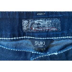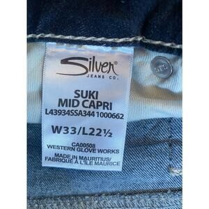 The product is a pair of Silver Jeans Suki Capri Jeans for women in size 33 and length 22.5 inches. The jeans are made of stretch denim in a stylish blue color, featuring the signature Silver Jeans Suki model. These mid-rise Capri jeans are perfect for a casual yet put-together look, with a comfortable fit that is ideal for everyday wear.