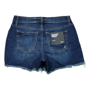 Women's Silver Jeans Co. Suki Curvy Fit Mid Rise Jean Shorts in dark wash blue stretch denim with raw, frayed, or cutoff hem. New with tags. Women's size 29x4", real measurements shown in photos with shorts laid flat: