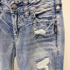 Preowned. Highly distressed, mainly at the hips, knees, and back hem. Waist measures approx 31”. Rise measures approx 8.75”. Inseam measures approx 29”. Light wash, Classic stretch. Contrast stitching, Silver Jeans logo patch and buttons. Embroidered back pockets.