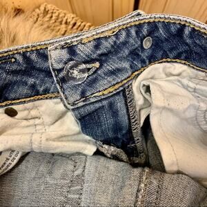 Cute jeans that have been hemmed into capris. Cross over button is a sweet change from traditional jeans.