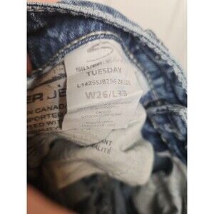 The Silver Jeans Tuesday Low Rise Boot Cut in a size 26x33 is a stylish pair of women's jeans in a medium wash with embroidered accents. Made from a blend of polyester and cotton, these denim jeans feature a zip and button closure, a low rise fit, and a bootcut style. The garment care instructions recommend machine washability, making them easy to maintain. With a solid blue color and a brand known for quality, these Silver Jeans offer a comfortable and fashionable choice for any season.