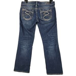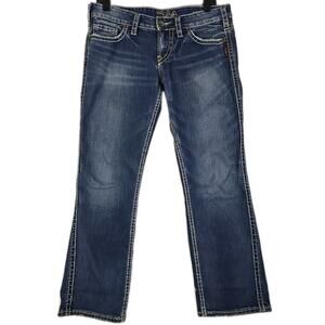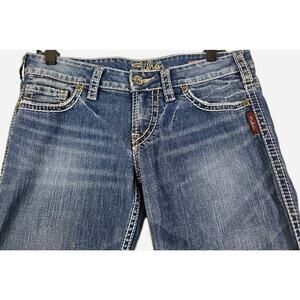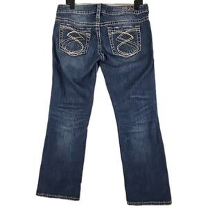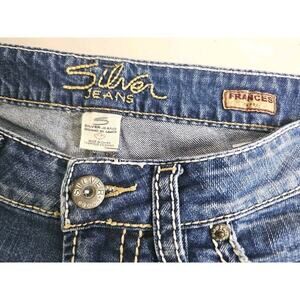 This product is a pair of Silver Jeans Frances Capri jeans in a size 29 and a classic blue denim color. They feature a low rise with a 24-inch inseam, making them perfect for a casual and trendy look. The jeans have a zip and button closure, along with embroidered and logo accents for added style. The cotton blend fabric wash is medium, and the 5-pocket design offers practicality for everyday wear. Ideal for all seasons, these Silver Jeans are a stylish addition to any wardrobe.