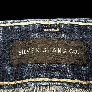 Pair of Silver Jeans Women in size 28x33 with a bootcut style and a dark wash finish. These jeans are made from a comfortable and stretchy denim fabric with a mid-rise waist. They feature a classic 5-pocket design and are machine washable. The color is a solid blue with subtle logo accents, embodying a modern American style. Perfect for year-round wear, these Silver Jeans Suki Surplus are a versatile addition to any woman's wardrobe.