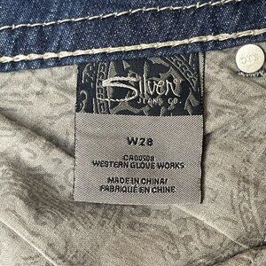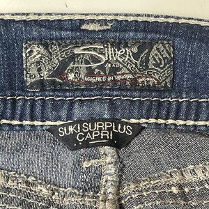 Silver Jeans Womens 28 Blue Suki Surplus Capri Embroidered Flap Pockets Stretch. Cotton Spandex Blend. Good pre-owned condition. One back pocket buttons is very loose. See pictures for details. See photos for measurements. Ships quickly from smoke-free home.