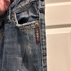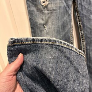 Good pre owned condition. Some wear on the hems as shown. Distressed. Distressing has been patched underneath, so you still get the distressing with modesty and warmth.. Flap pockets. Tagged 29X31. Measures 30X28.