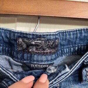 Silver Jeans Women's Contrast Stitch Embroidered Pocket Tuesday Crop Jeans Sz 28. Measurements Waist: 28" Inseam: 18" Rise: 7" Offers always welcome! Measurements are approximations taken while hanging