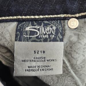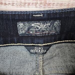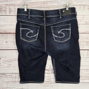 Classic dark blue jean shorts by Silver Jeans. Features contrast stitching and a comfortable fit. Ideal for everyday wear.