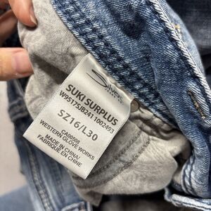 The Silver Jeans Women's Suki Surplus in size W16/L30 is a stylish pair of blue denim jeans with a boot cut design and flap pocket detail. Made from a comfortable and stretchy spandex and cotton blend denim fabric, these mid-rise jeans feature a flattering fit for plus-size women. The western and bohemian theme adds a touch of personality to the timeless wardrobe staple, making it a versatile and trendy addition to any outfit.