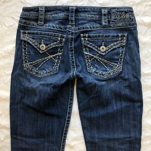 Dark Wash Distressed Flap Pockets Cut Off Silver Jeans Denim Capri.