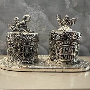 Charming silver keepsake boxes for first curl and first tooth. Features intricate fairy designs.