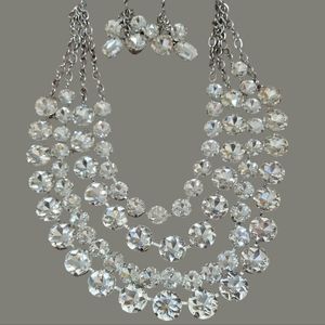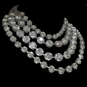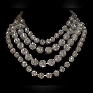 17" with a 2" adjustable hook clasp, 4 layers with Rhinestone design. It is absolutely beautiful and comes with a pair of earrings that match the design of the necklace. Nickel Free. Never been worn.
