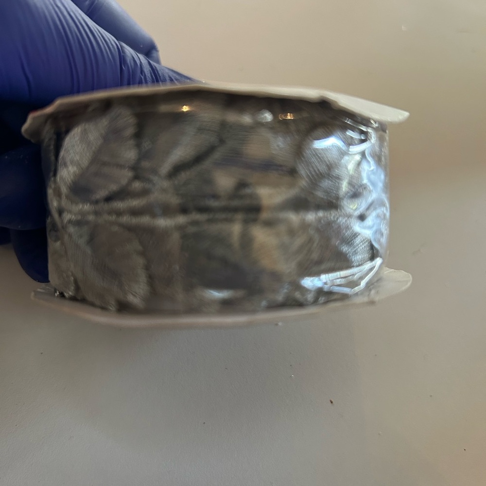 Elegant silver ribbon with a leaf pattern. Perfect for crafts and decorations.