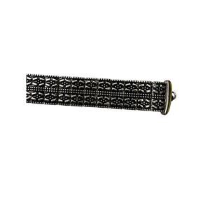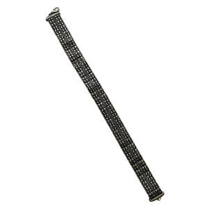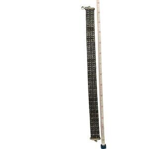 Wide silver link choker necklace, most likely from the 90s. It's held together on a slightly elastic wire, so there's some flex to it. Each link is 5/16ths x 13/16ths in size. It is not adjustable other than the slight stretch. Measures 13 1/2" long - so it is small, even for a choker.